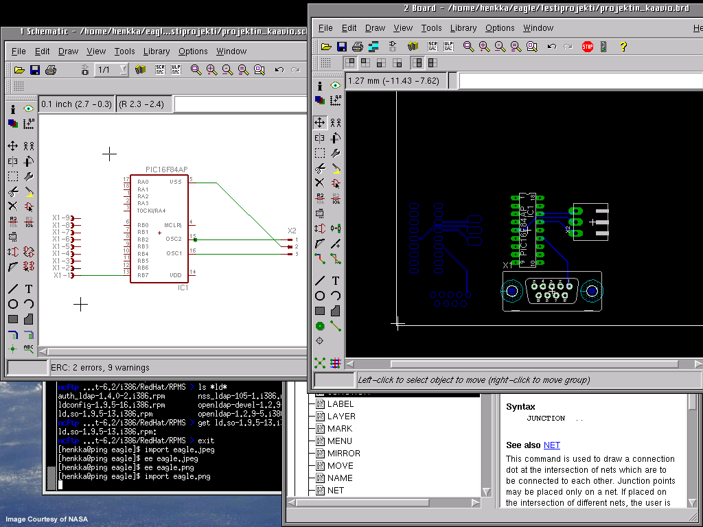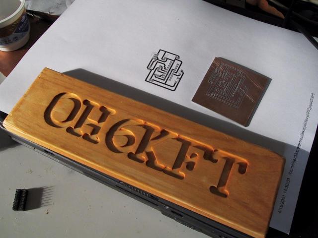 The target of the project is getting to be very near. Today I got working PCB and holes to it. I drilled holes manually because I didn't have suitable drill to mount to mill. I got drill-files out from Eagle, they seem to need a little perl-script too for EMC to understand them. PCB what I made just needs soldering and then I can say that I have fully working PCB-milling machine. I also made wooden sign, "OH6KFT" (my radioamateur callsign), for my "hamshack". I'm quite satisfied for the result.