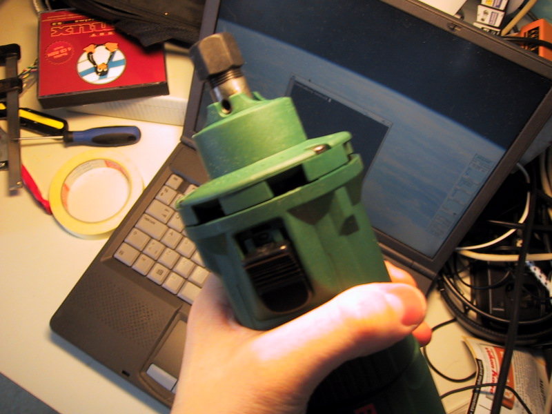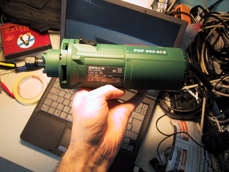 I bought better motor for my setup. It's a Bosch 600W router, 12000-27000 rpm. It's should be quite easy to attach to machine because it has nice round area just above the head. Below are couple of pictures of it. I decided that motor should be a) strong enough to mill some wood and b) it should last even when used continously hours. I was thinking about Dremel mini-drills, but after talking to one guy who has build many routers and CNC machines and after reading the CAD_CAM_DRO mailinglist I decided that Dremel was not good for this setup. The drill/motor is the most expensive part of this setup and it's no good to spoil whole thing by just using unsuitable motor. I hope I made the right decision. We'll see that after I attach it to my machine ;-)