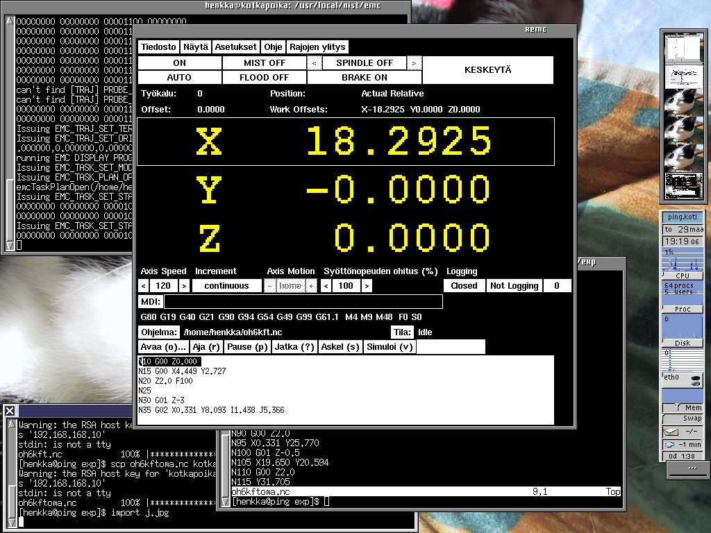 I'm nowdays milling PCB's and plastic with ease and with nice results. General feel of the process is every day getting to be more familiar. I'm using BDI EMC with RTLinux 3.0 and kernel 2.2.18.