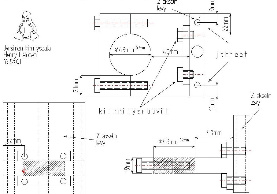 I added negative limit switches to machine. They are connected in parallel to paraller-port's pin 13 and if one of them closes then EMC's coordinate letters turn red and machine goes to "E-stop" state. I also draw an cad picture of part that's going to attach new motor to setup. The picture is drawn with QCad program's free-version. It was quite nice to use and more than sufficient for these little drawings. The output-dxf file didn't load correctly to autocad, possibly because of lettering problems. But I transferred the picture by jpg-file and it was sufficient for my father-in law to produce the part.