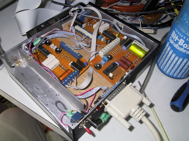 Here is my new control box. It's made from old NMT450 phone aluminium case. There is 30 pin cable between the box and the machine. Motors are attached with D9 connectors to part that changes three D9 connectors to 30 pin flat-cable connector.