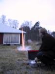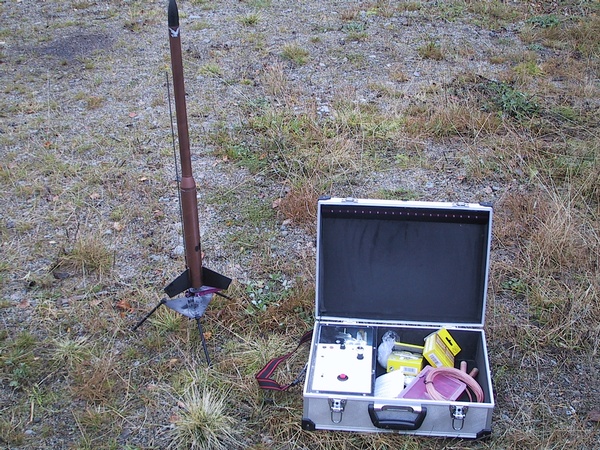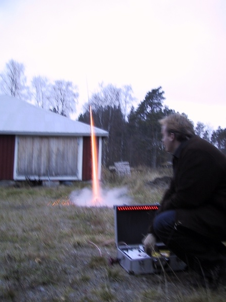 Here are couple of pictures taken from my friends (Janne) rocket. Notice that it really chakes the ground when the rocket starts ;-) I haven't made my own launcher yet, so laucher and rocket in the pictures belong to my friend Janne. But you get the general feeling what's this is all about.